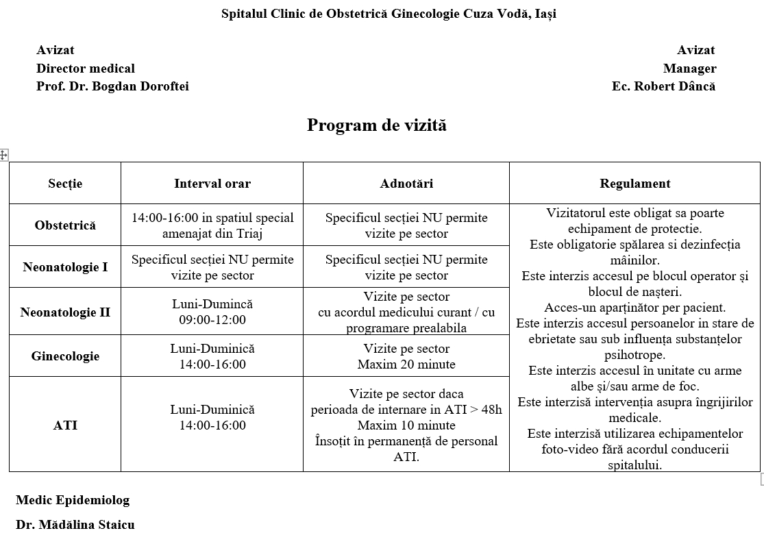 PENTRU PACIENTI SI VIZITATORI NECESAR PENTRU PACIENTE LA INTERNARE IN VEDEREA NASTERII Drepturile si obligatiile pacientuluiReglementate prin LEGEA DREPTURILOR PACIENTULUI nr. 46 din 21 ianuarie 2003Programul de vizite![]() PROGRAMARIProgramarile pentru consultatii se fac la tel: 0232-213000 int.140Pentru consultatii in Ambulatoriu: 0771764336 PROGRAMARI ONLINE - fa o programare PROGRAM DE LUCRU AMBULATOR INTEGRAT LISTA TELEFOANE SECTII SPITAL ACTE NECESARE LA INTERNARE - card de sanatate - carte de identitate -bilet de trimitere de la medicul de familie sau medicul specialist ELIBERAREA ACTELOR Eliberarea certificatelor constatatoare de nastere sau deces se face zilnic intre orele 13.00-15.00 EXTERNAREA PACIENTILOR - se face pe baza biletului de iesire din spital intocmit de medicul curant si semnat de medicul sef de sectie. Biletul de iesire din spital se inmaneaza pacientului, iar foaia de observatie se indosariaza. - se intocmeste scrisoarea medicala semnata de medicul curant si medicul sef de sectie - la externare, pacientului i se valideaza in mod obligatoriu dosarul electronic pe baza cardului de sanatate/adeverinta emisa de CJAS Iasi care atesta calitatea de asigurat. - pacientele minore se vor externa doar insotite de apartinatorul legal (parinte sau tutore cu notificare notariala) care va prezenta o copie a BI/CI ce va fi anexata la FOCG a minorei. In cazul in care lehuza este minora, o copie a BI/CI va fi atasata si la FOCG a nou nascutului - spitalul are obligatia de a intocmi si elibera pacientului decontul de cheltuieli pentru serviciile medicale efectuate Informatii cu privire la tipurile de investigatii paraclinice pe care le efectuam se pot obtine la Biroul Informatii: telefon 0232-213000 int.103 TAXA SOLICITARE DOCUMENTE DIN ARHIVA SPITALULUI - 500 lei conform Hotararii C.A. a Sp.Cl.OG Cuza Voda nr.5/05.04.2023 TARIFELE SERVICII MEDICALE CU PLATA